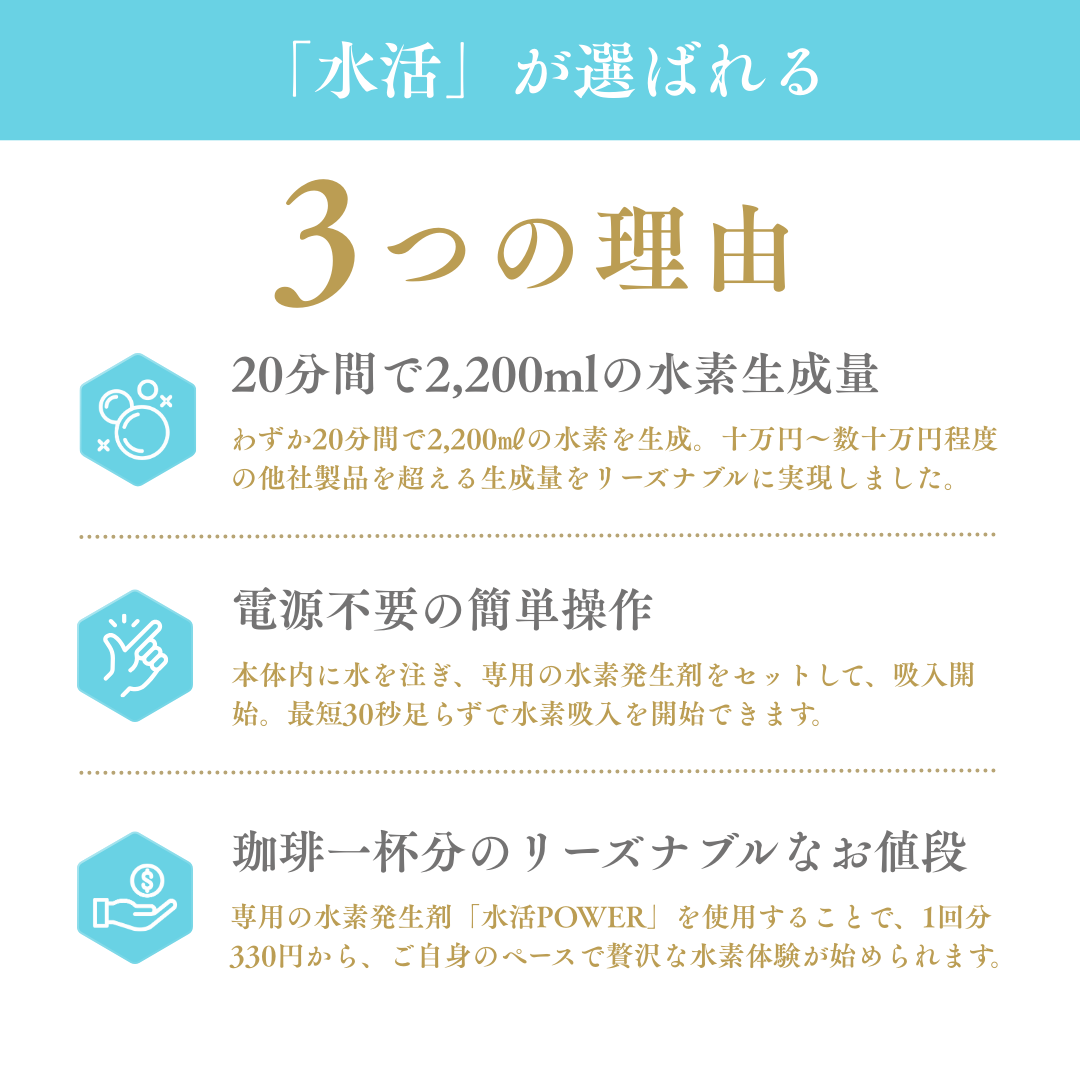 なぜ、今「水活」が選ばれているのか。その答えは、圧倒的な「性能」と「手軽さ」の両立にあります。 他社製品を凌駕する水素生成量、電源不要の利便性、そして毎日続けられるコストパフォーマンス。これら3つの要素が高い次元で融合し、多くの方々に支持されています。