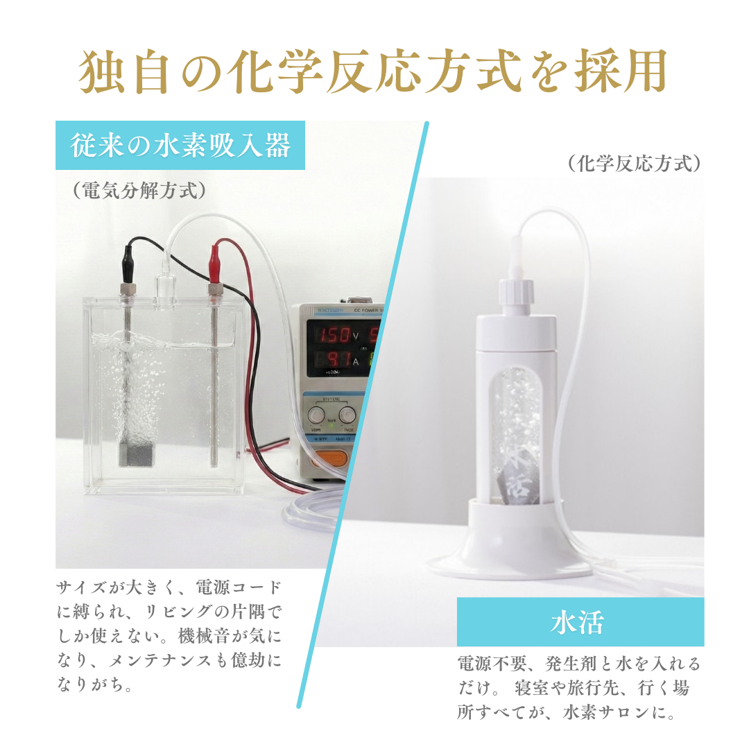 従来の常識を覆す、独自の「化学反応方式」を採用。 これまで主流だった電気分解方式の課題であった「高額な本体価格」「電源の制約」「メンテナンスの手間」をすべて解消しました。場所を選ばず、静音で清潔。それが「水活」の技術革新です。