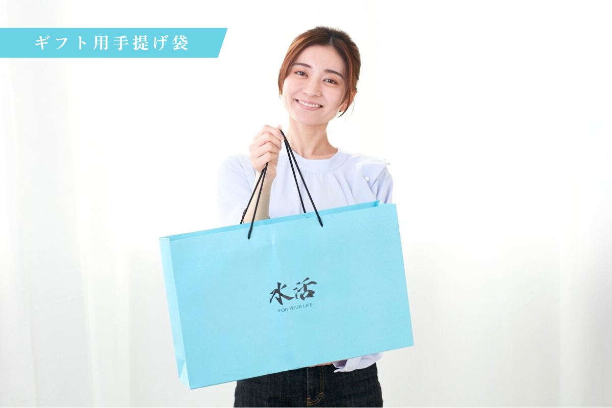 「水活」本体セットには、上質な質感の専用ギフトバッグ(手提げ袋)が標準で付属いたします。 ご両親への感謝の印として、あるいはパートナーへの記念日に。 届いたその日に、そのまま手渡しできるパッケージングで、あなたの温かいお気持ちをサポートいたします。